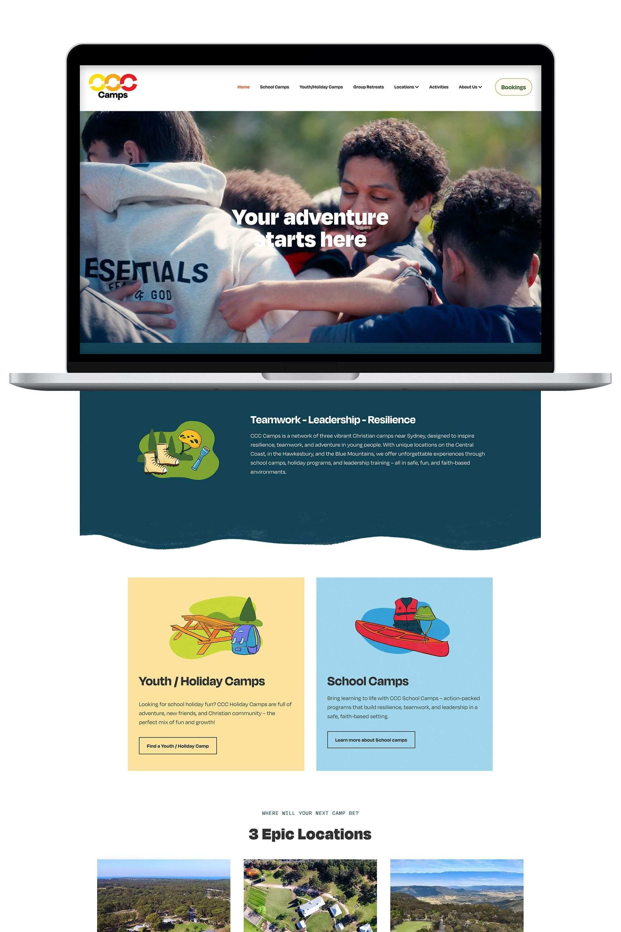 CCC Camps is a network of three vibrant Christian camps near Sydney, designed to inspire resilience, teamwork, and adventure in young people. With unique locations on the Central Coast, in the Hawkesbury, and the Blue Mountains, it was important to capture each site location and lean into what each one offers.